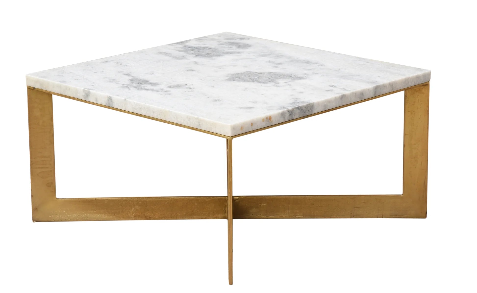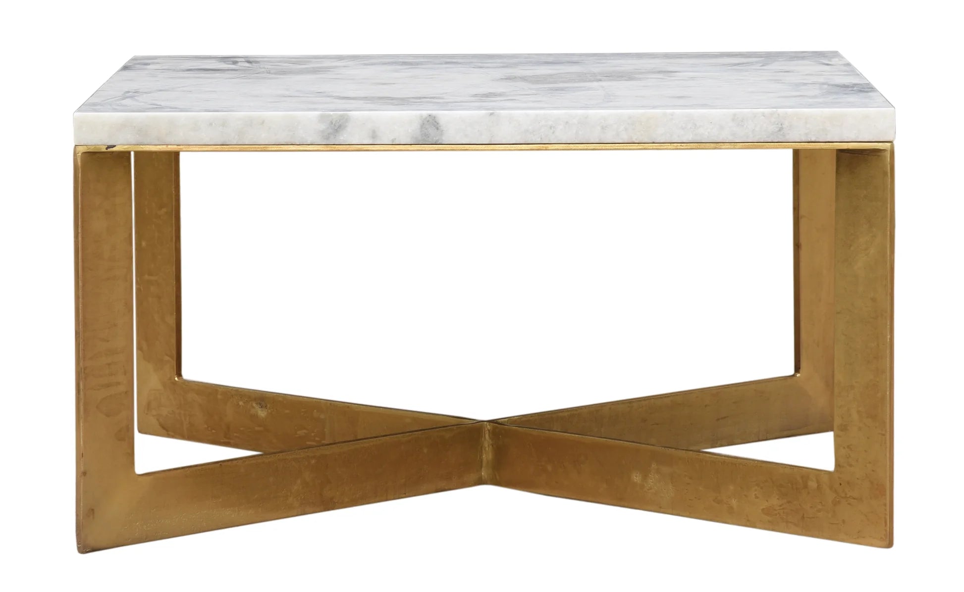 The square Carrara-style marble top offers soft veining and organic depth, while the intersecting steel base, finished in a brushed brass tone, creates a strong foundation with architectural clarity. Whether styled in a modern cabin or a warm minimalist living room, The Halston centers the space in grace and form.